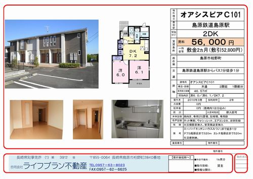 | 所在地 | 島原市柏野町 | 間取タイプ | 2DK | 賃料 | 56,000円 | 一時金等 | 敷金2ヵ月(敷引52,800円) | 仲介手数料 | 1ヵ月分 | 共益費 | 0円 | 駐車場 | 0円 (敷地内1台分込み) | 保険 | 要 火災保険への加入 家賃保証原則加入 | 間取り | 洋6.0/洋6.1/DK7.2 | 面積 | 46.57㎡ | 入居可能日 | 即時 | 設備 | 南向き、専用ゴミ置場、駐輪場、専用庭、ネット無料、ウォシュレット、エアコン2台、浴室乾燥 | 備考 | スーパー「キッチンハウスみつい」まで徒歩1分、ナフコ島原店まで320m エレナ島原店まで520m、生活便利地。 |